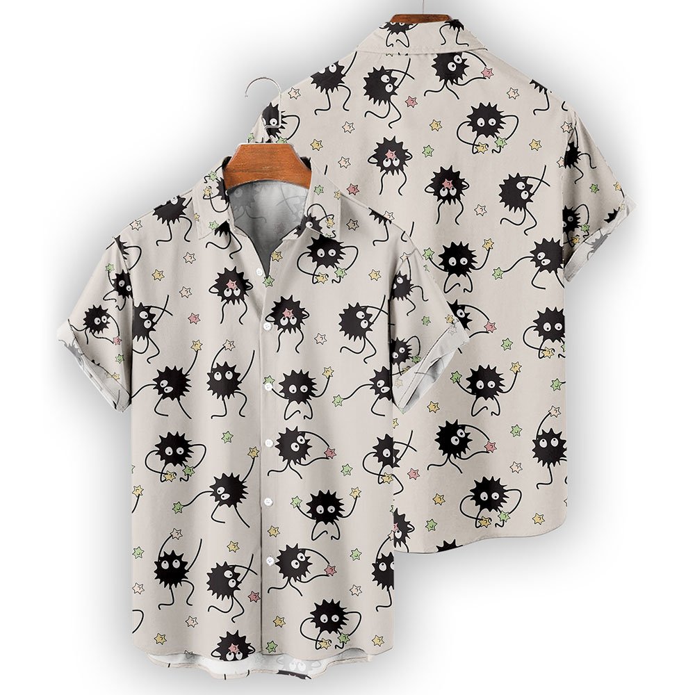Bring a touch of whimsical charm to your summer wardrobe with this Soot Sprite Hawaiian Shirt. Inspired by the beloved dust creatures from classic Ghibli films like My Neighbor Totoro and Spirited Away, this playful design features soot sprites scattered across the fabric, each clutching colorful star-shaped candies.