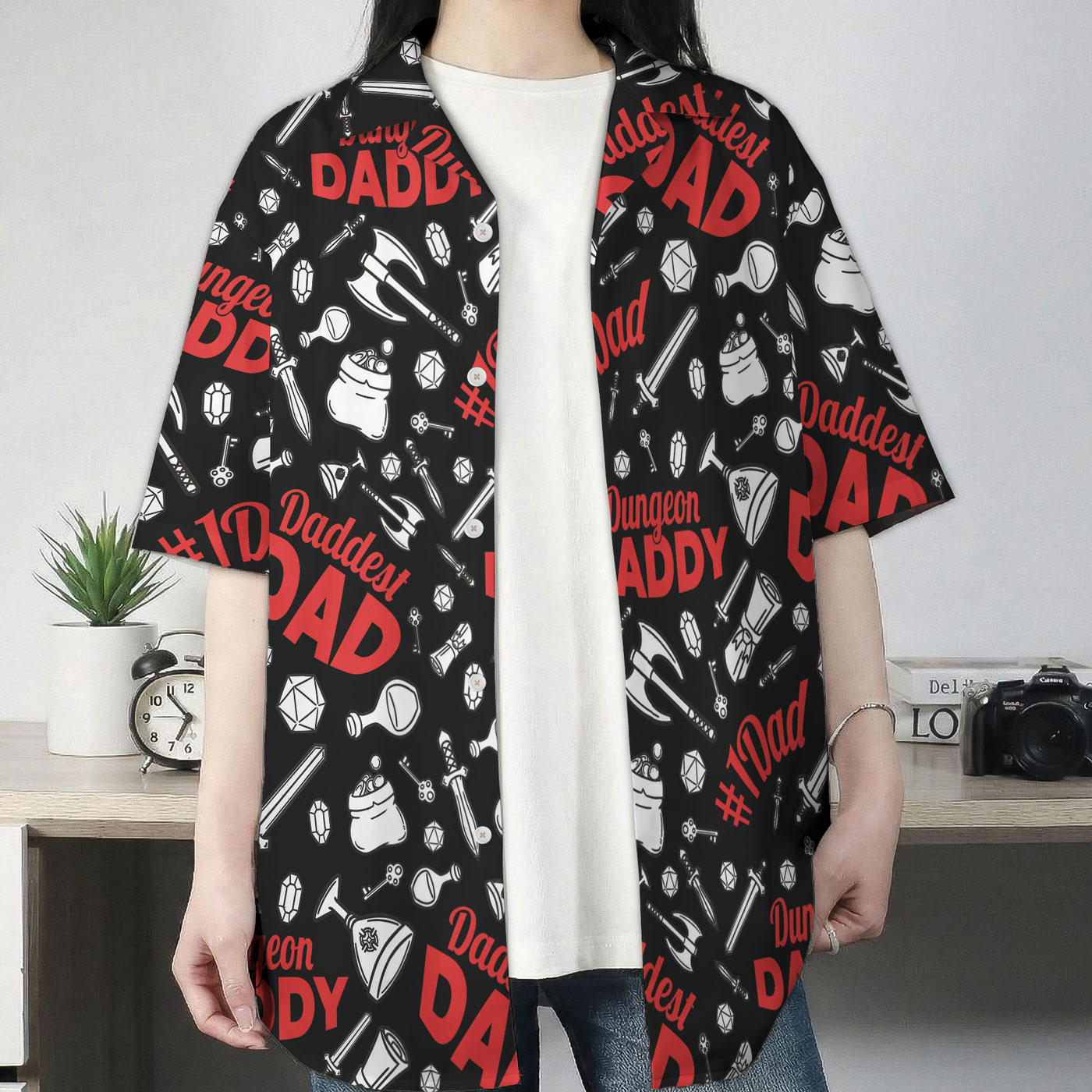 Show off your tabletop pride with the Dungeon Daddy DND Dad Black Hawaiian Shirt. Featuring iconic DND dice, swords, potions, and bold red lettering on a black base, this shirt blends humor, fandom, and comfort—perfect for game nights, conventions, or the ultimate gift for DND dads.