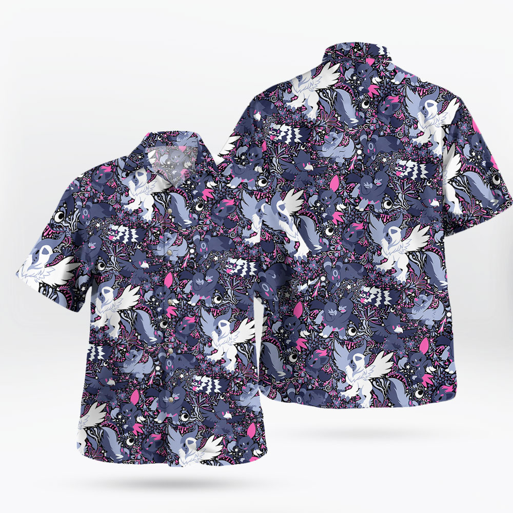 Dive into the shadows with powerful Pokemon striking under the moonlight. This Hawaiian shirt combines sleek tropical style with dark, battle-ready energy — perfect for fans who prefer the bold and mysterious side of the Pokemon world.