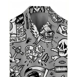- Perfect for casual outings, beachwear, or parties, this shirt adds a unique touch to your wardrobe. The intricate skull design with fallen wings harmoniously blends with the colorful backdrop, making a strong visual statement. The short sleeves and relaxed fit provide ease and comfort, making it ideal for warm weather and festive events.