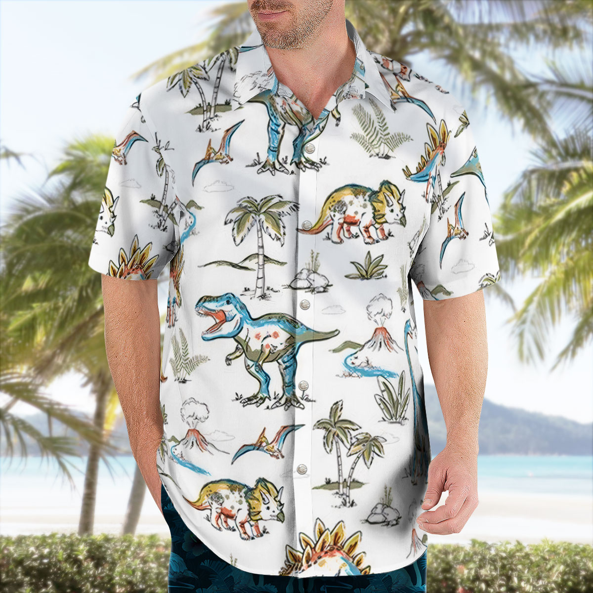 This Watercolor Dinosaur Hawaiian Shirt from Tropi Hawaiian Shirts blends playful hand-sketched dinos with tropical details for a bright, artistic summer look. Soft, light, and comfortable—ideal for vacations, weekends, or anyone who loves creative dinosaur designs.